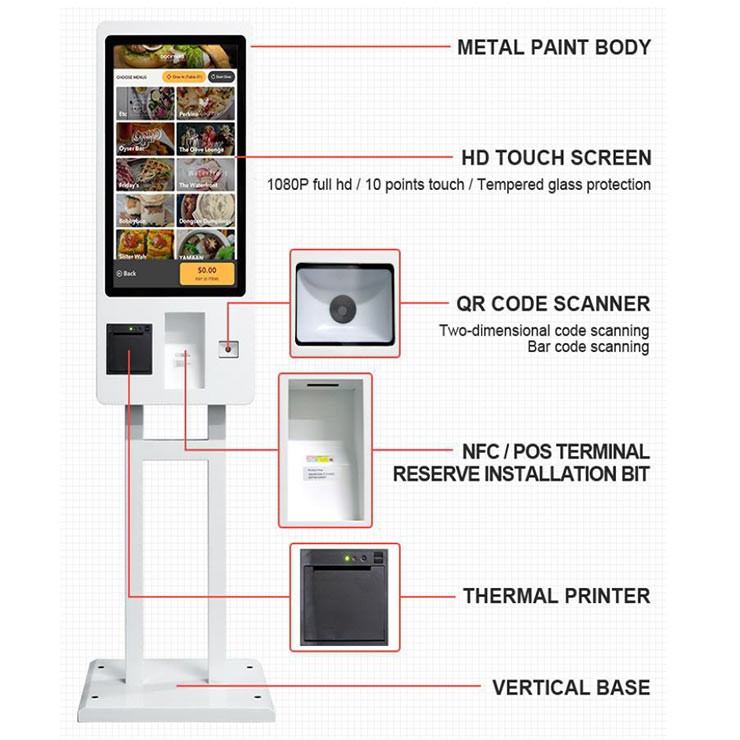 De plus, cette Borne à écran tactile self service est équipée d’une imprimante thermique de 80 mm, d’un scanner de code à barres 2D et d’autres périphériques tels que module NFC ou RFID, webcam, et un écran tactile 10 points 21″ ou 27″.